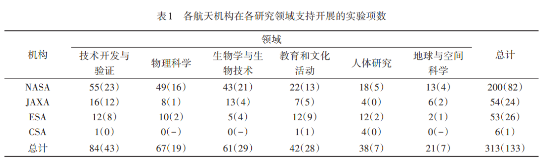 NASA、日本宇宙航空研究开发机构(JAXA)、欧洲航天局(ESA)和加拿大航天局(CSA)在6大研究领域支持开展的实验项目数及其中新实验的项数如下表所示。