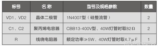 本制作共用了5个元器件(不包括所用废旧日光灯管及控制开关SA),采购清单见表16。