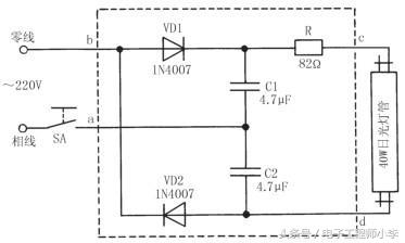 晶体二极管VD1、VD2和电容器C1、C2组成了典型的二倍压全波整流电路。接通电源开关SA,220V交流市电经晶体二极管VD1、VD2整流后,在电容器C1、C2充放电作用下,使日光灯管两端获得高达620V的直流电压,将灯管迅速激活发光。灯管点亮后,受限流电阻器R和电容器C1、C2容抗的限制,灯管两端电压会自动降至110V以内,从而使灯管安全、稳定地工作。