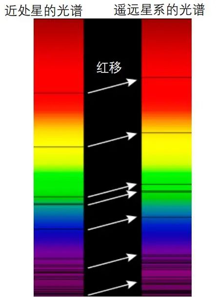 图4 红移 邻近(左)和遥远(右)星光的光谱中,都有比例相同的夫琅和费线,但是遥远星光的夫琅和费线出现在光谱中更红的区域,这个现象便是红移。