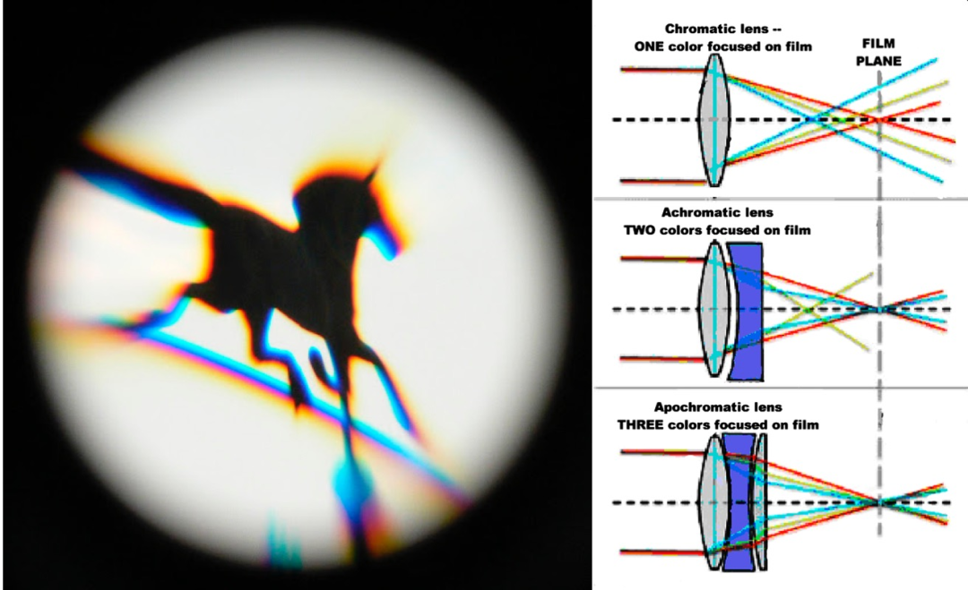 图6 色差与消色差透镜 左为廉价望远镜看到远处物体,边上围绕着小彩虹。