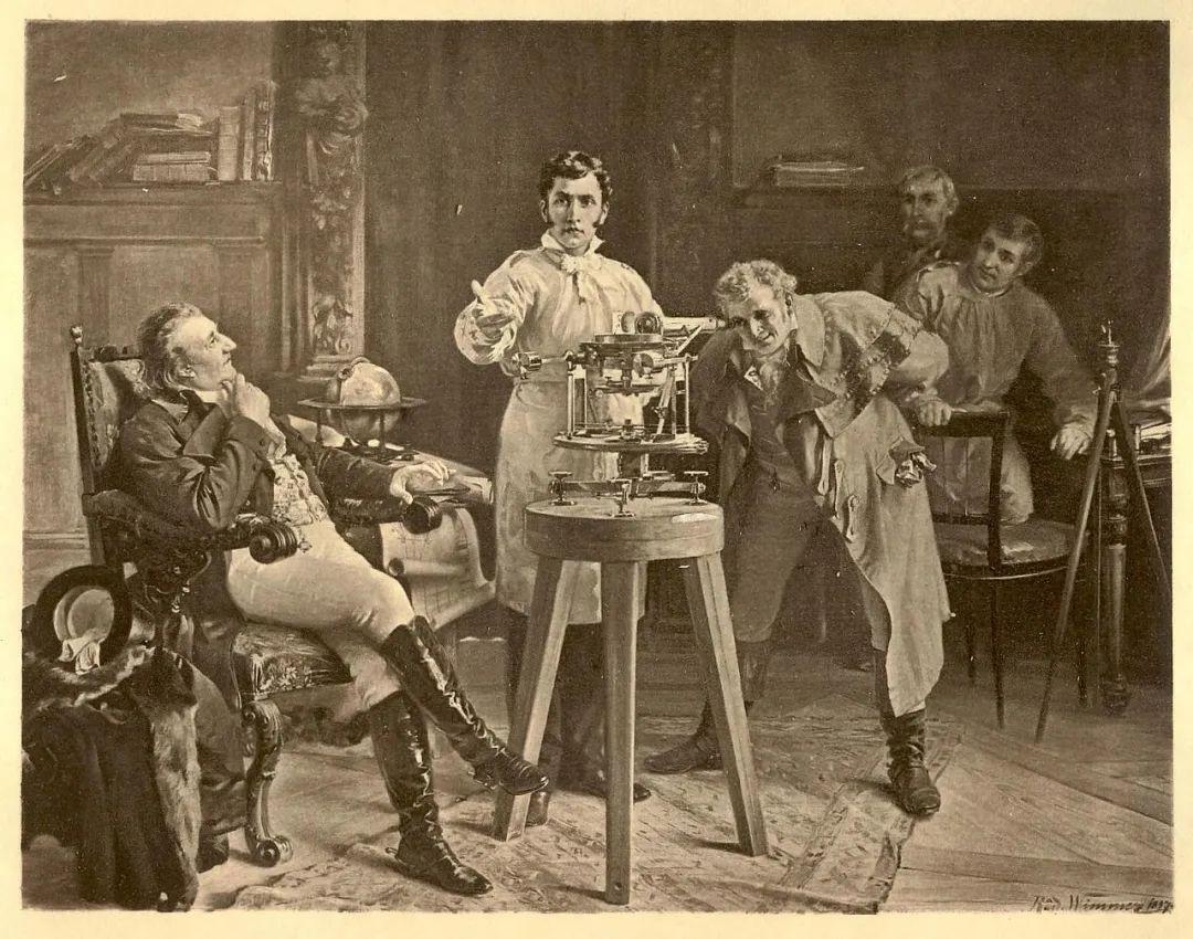 图3 分光计 夫琅和费(前景中间站立者)向科学家们展示他新发明的分光计。