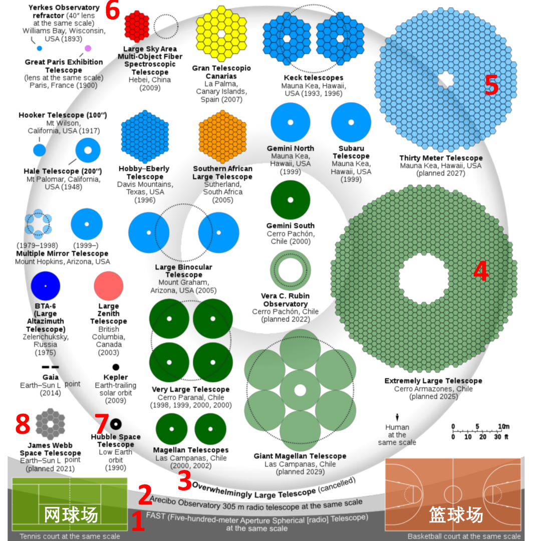 提了那么多望远镜,最后总结一下,来个口径大比拼吧(图16)。图中(1)为世界口径最大的中国天眼,图中只显示了一个边边。(2)为第二大的305米波多黎各Arecibo射电望远镜,自1963年建成后服役53年,终因经费不足年久失修,于2020年垮塌报废。(3)为最大的光学望远镜项目,欧洲筹划的100米口径光学望远镜,但因资金问题项目被砍,缩小成了目前正在建造的ELT(4)。(5)为筹建中的夏威夷30米望远镜。(7)和(8)分别是哈勃和韦伯太空望远镜。(6)是河北兴隆天文台的郭守敬望远镜(大天区面积多目标光纤光谱望远镜, LAMOST),用于研究宇宙结构。想法很好,设备也先进,但硬伤是离人口稠密地区太近,光污染严重,晴朗天气少。