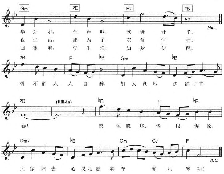 在谱例中我们可以看到乐谱上有一些字母标记,其实它们是用来表示伴奏所用的和弦的。
