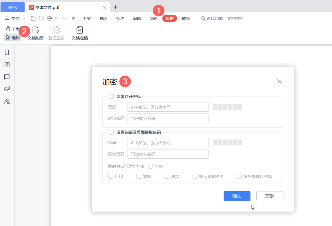 PDF 文件: 上方选项卡【保护】-【文档加密】-选择【文档加密】