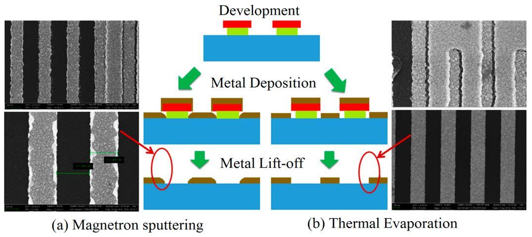 通常,MEMS工艺中的电子束光刻主要流程依次为:基片表面预处理、涂覆光刻胶、前烘、电子束曝光、显影、定影、金属沉积及去胶等工艺环节。整个光刻工艺流程较为复杂,总体光刻示意图如下。