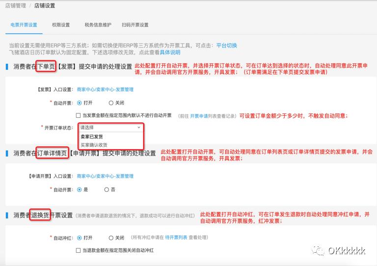 支持自动开票,可设置交易完成后开票还是发货后开票。