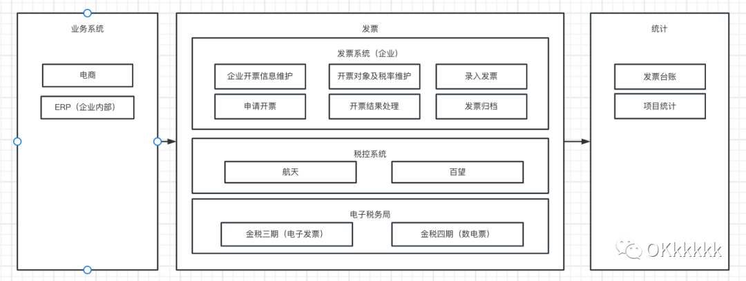 整体对于企业内部来说,会涉及到业务系统、发票、数据统计,三个系统交互;