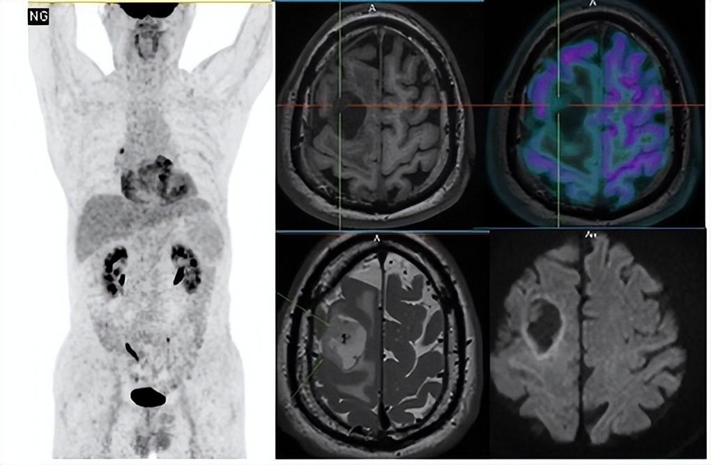 杨大爷(化名)因左侧肢体无力、晨起突发意识不清来到大医一院急诊就诊。MR检查发现右侧额叶肿物,是肿瘤脑转移还是脑内原发肿瘤,一时间难以确定。由于这两种疾病治疗方法不同,临床医生建议行PET进行全身扫描,杨大爷随后来到核医学科检查。PET/MR提示除右额叶肿物,全身其他各部位未见恶性肿瘤征象,从而确定右额叶肿物为脑内原发肿瘤,核医学科医生结合肿物的PET及MR影像特点,考虑为胶质母细胞瘤。杨大爷在得到明确诊断后,立刻进行了手术治疗,术后恢复良好出院。