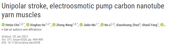2021 年 1 月 29 日,题为 Unipolar-Stroke, Electroosmotic-Pump Carbon Nanotube Yarn Muscles(单极冲程、电渗泵碳纳米管纱线肌肉)的论文发表于著名学术期刊《科学》(Science)。