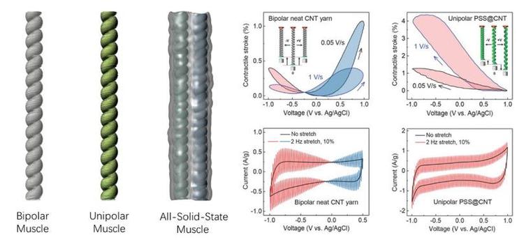 哈尔滨工业大学官方表示,研究人员首次发现通过聚电解质功能化的策略,可实现人工肌肉智能材料的“双极”(Bipolar)驱动转变为“单极”(Unipolar)驱动(如下图所示),同时发现了人工肌肉随电容降低、驱动性能增强的反常现象(Scan Rate Enhanced Stroke, SRES)。
