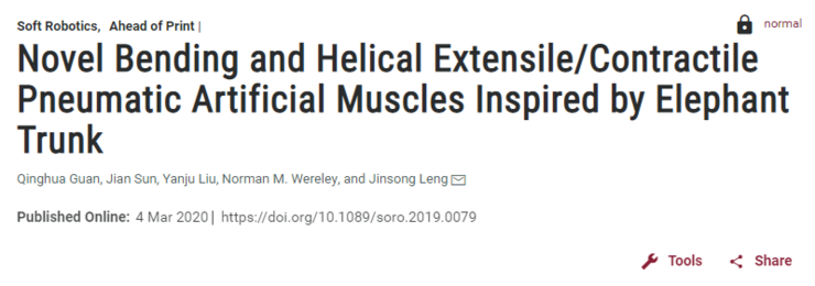 2020 年 3 月 4 日,冷劲松教授团队与美国马里兰大学 Norman M. Wereley 教授团队的共同研究成果发表于国际著名期刊 Soft Robotics ,展示了一种受象鼻启发的、在可伸展/收缩的气动人工肌肉的基础上设计的新型弯曲螺旋可伸展/收缩气动人工肌肉(HE-PAMs/HC-PAMs)。