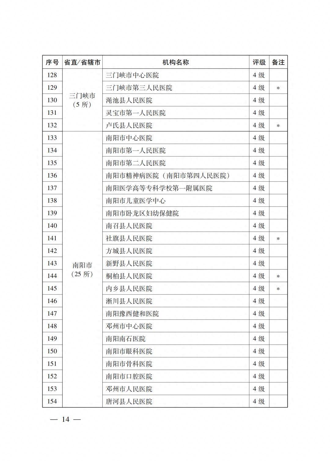 5级14所,共包括6所省直医疗机构,8个省辖市的9所市级医疗机构,1所县级医疗机构平舆县人民医院。
