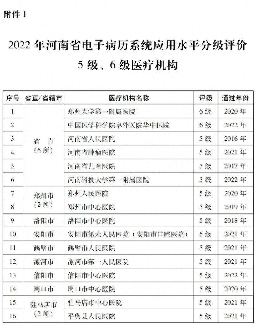 2022 年河南省电子病历系统应用水平分级评价5级、6级医疗机构中,高级别医疗机构16所: