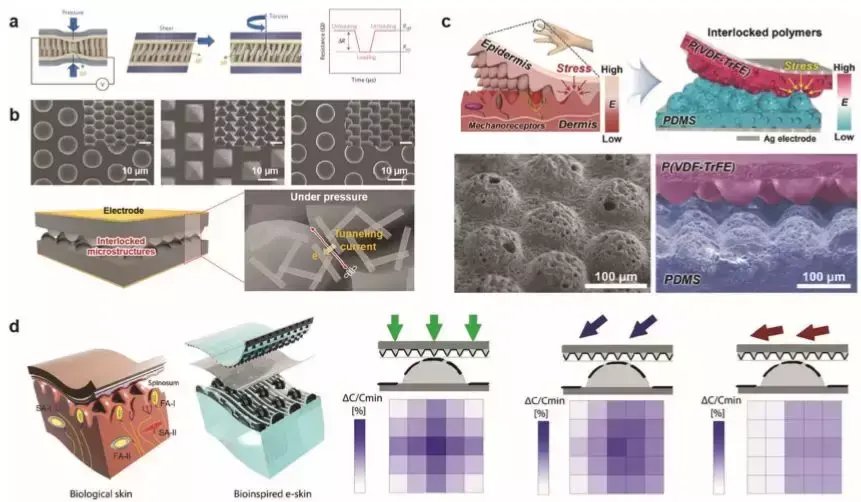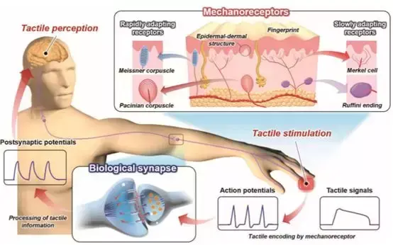 这篇综述涵盖并突出了仿生电子皮肤模仿人类和生物皮肤的感知特性。特别地,我们将分别讨论人类皮肤触觉过程中的五个主要组成部分,并结合电子皮肤模拟人类皮肤独特的感知机制的最新进展进行讨论。此外,从独特的结构和功能中获得灵感,如刺激的视觉表达、可逆粘附、易变形性、自然生物皮肤的伪装等,介绍了用户交互、皮肤可接触、超敏感的电子皮肤的各种功能。此外,还介绍了使用仿生电子皮肤进行身体运动跟踪、健康监测和假肢的新兴可穿戴传感器系统。最后,讨论了实现下一代皮肤电子产品应考虑的几个挑战,以及解决这些挑战的最新成果。