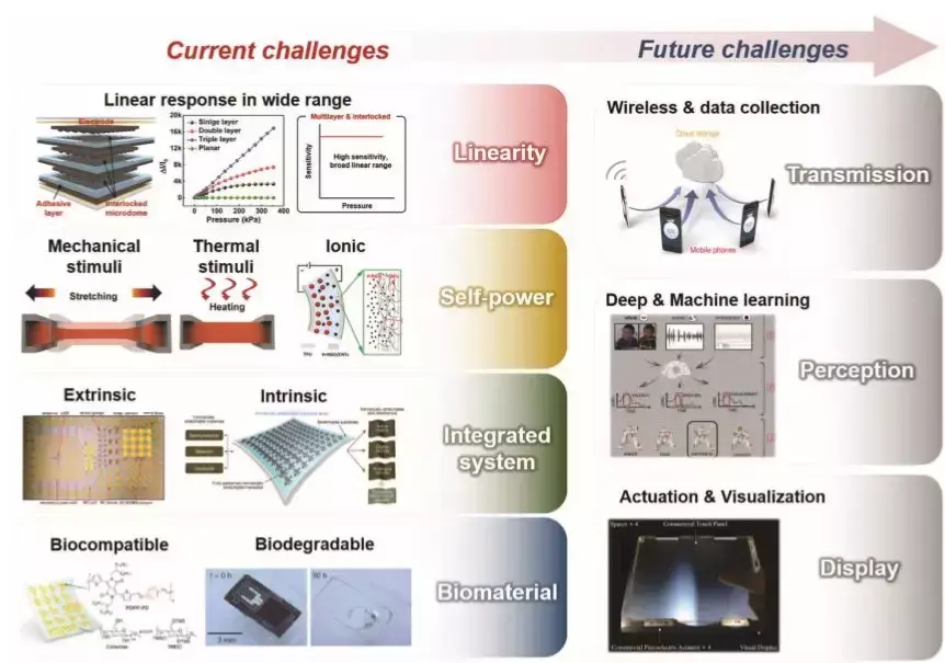 图4-电子皮肤当前和未来发展的困难和挑战。