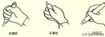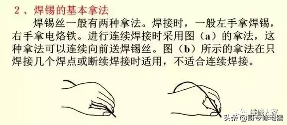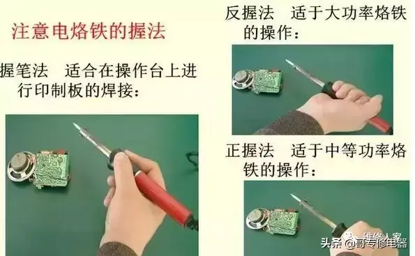 为了人身安全,一般电烙铁离开鼻子的距离 通常以30cm为宜。电烙铁拿法有三种。反握法动作稳定,长时间操作不宜疲劳,适合于大功率烙铁的操作。正握法适合于中等功率烙铁或带弯头电烙铁的操作。一般在工作台上焊印制板等焊件时,多采用握笔法。