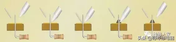 (5)移开烙铁:焊锡的扩展范围达到要求后,拿开烙铁,注意撤烙铁的速度要快,撤离方向要沿着元件引线的方向向上提起。