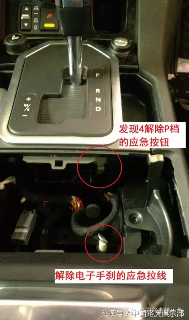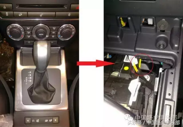 上图是路虎 神2 P档的应急解除位置,从图中红圈内有个黄色的机构,通过工具或手向下按,解除。
