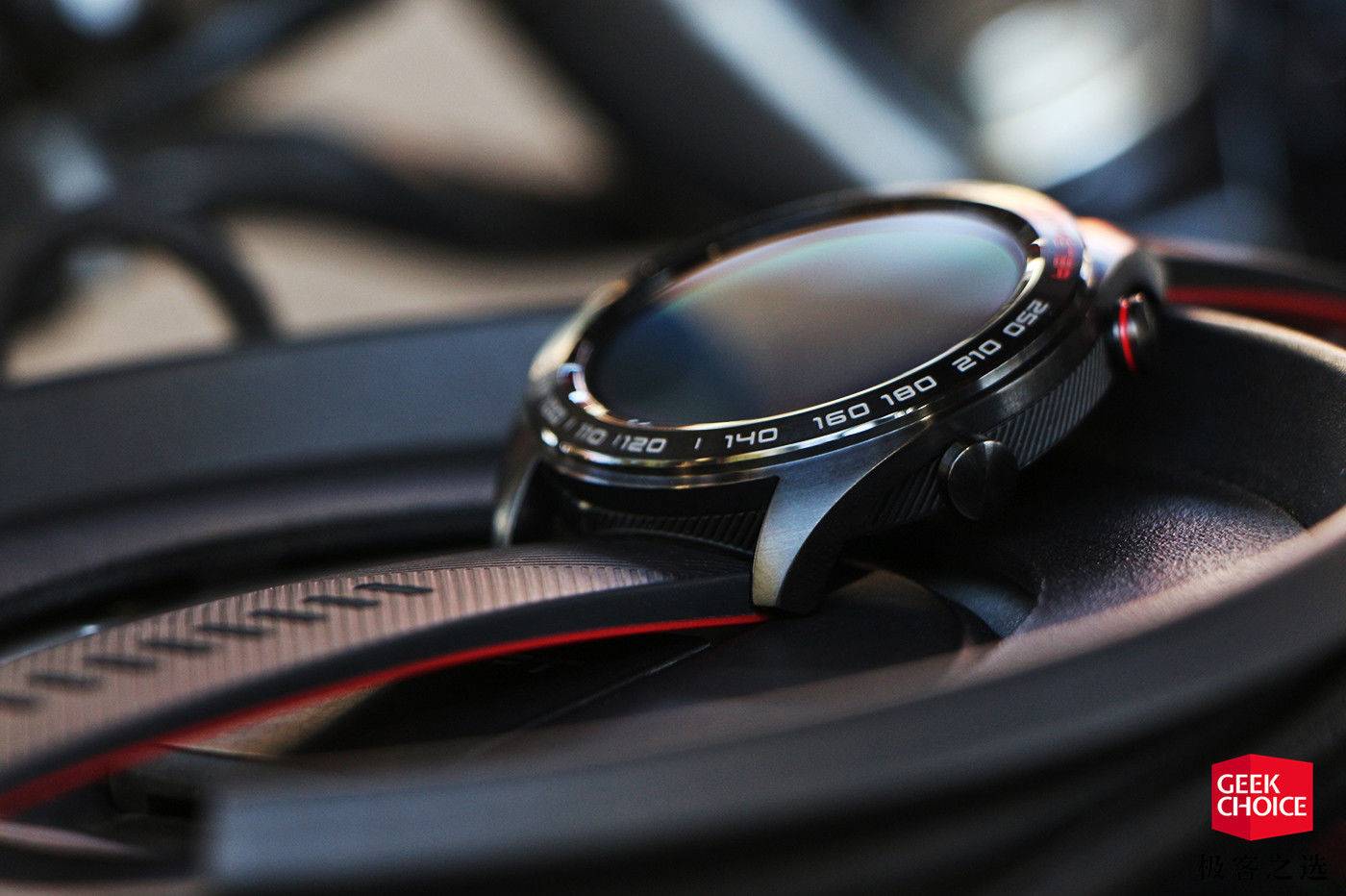 荣耀手表的核心目标用户为喜欢新潮、酷炫的科技产品,以及充满活力的年轻人。所以对比两年前的荣耀手表 S1,这次荣耀手表更加强调了运动感。它不仅在表圈上设计了非常明显且密集的刻度,还加入了象征运动的红色「TACHYMETER」字样。