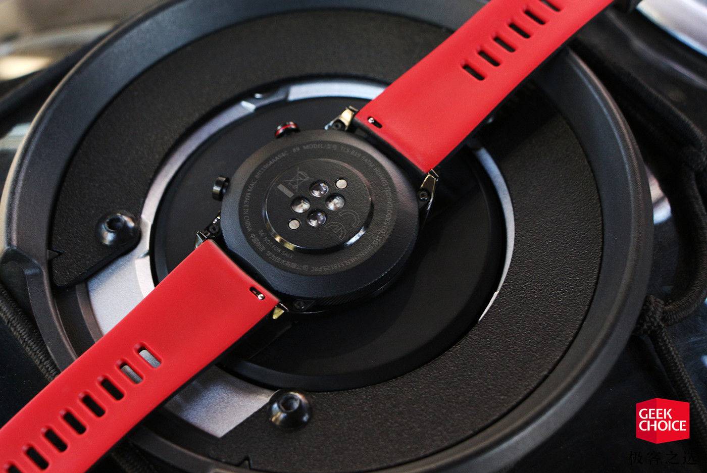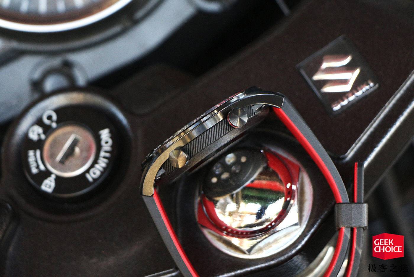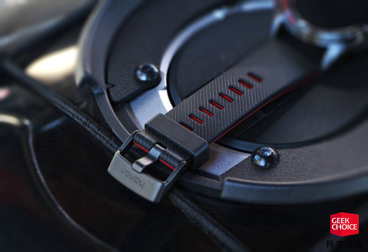 表带部分,我们拿到的熔岩黑版本搭配了熔岩黑红硅胶表带,而月光银版本则为砂砾棕皮胶表带。以熔岩黑红硅胶表带为例,为了进一步突出运动感,它的正面做了很多条状纹理,同时背面也采用了统一的红色配色。