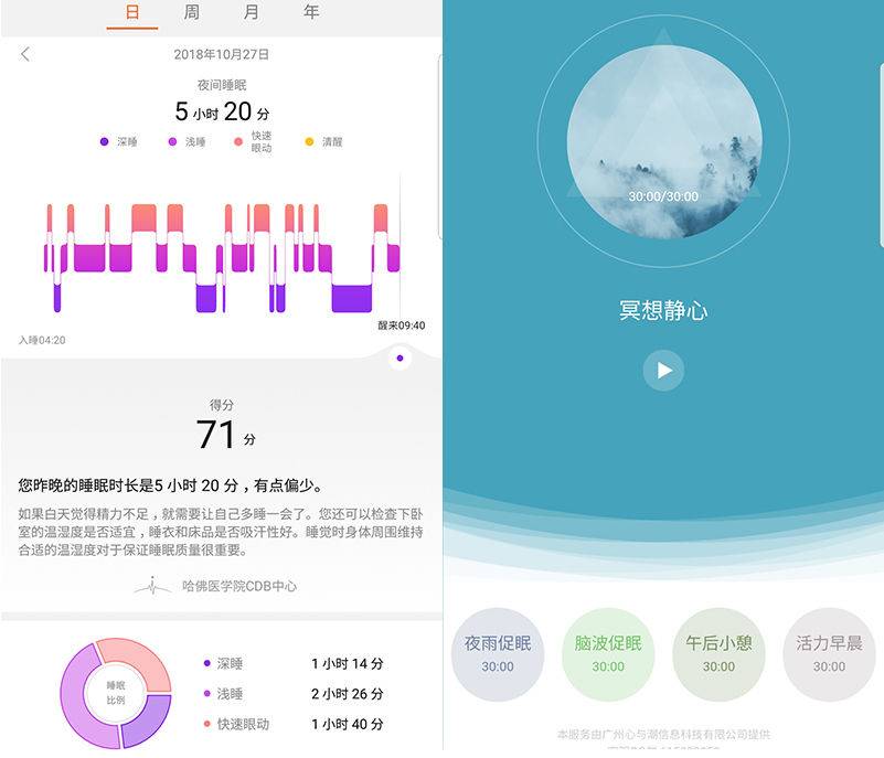 和之前我们做过评测文章的荣耀手环 4 一样,这次荣耀手表也同样支持 HUAWEI TruSleep 睡眠检测技术。其能够自动识别你的入睡/出睡时间以及睡眠状态(包括浅睡、深睡、REM 快速眼动和清醒,从而为你提供睡眠建议、睡眠音乐和舒缓解压等服务来改善睡眠习惯。