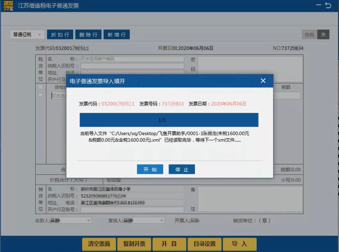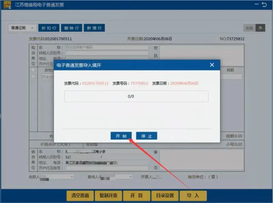 第八步: 点击开票软件中的“导入”按钮,弹出电子发票导入填开对话框,然后点击“开始”按钮