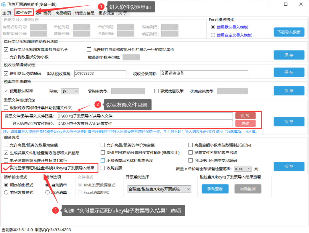 第六步: 进入软件设定界面,设置发票文件目录、勾选“实时显示百旺税控盘/税务Ukey电子发票导入结果”选项