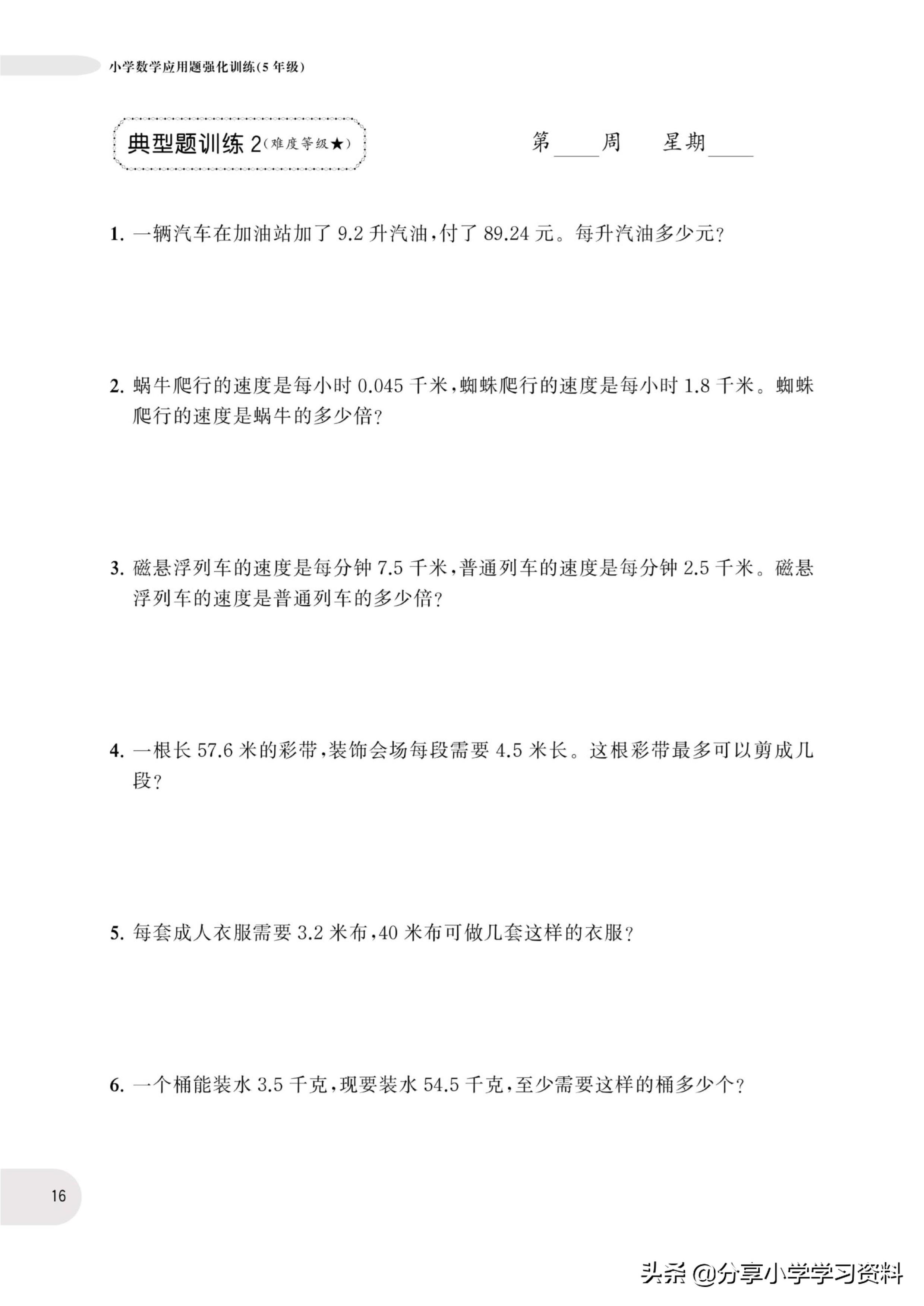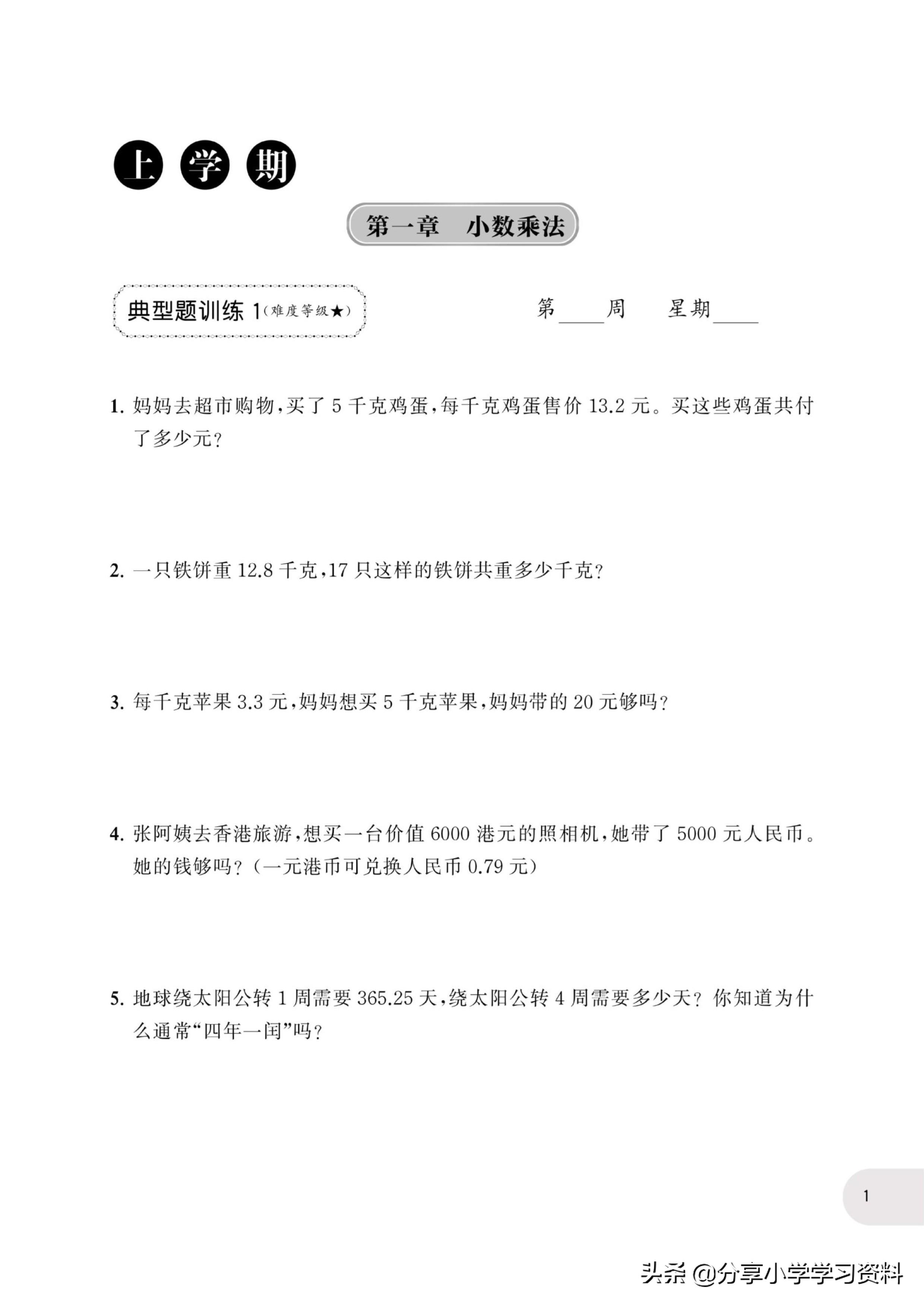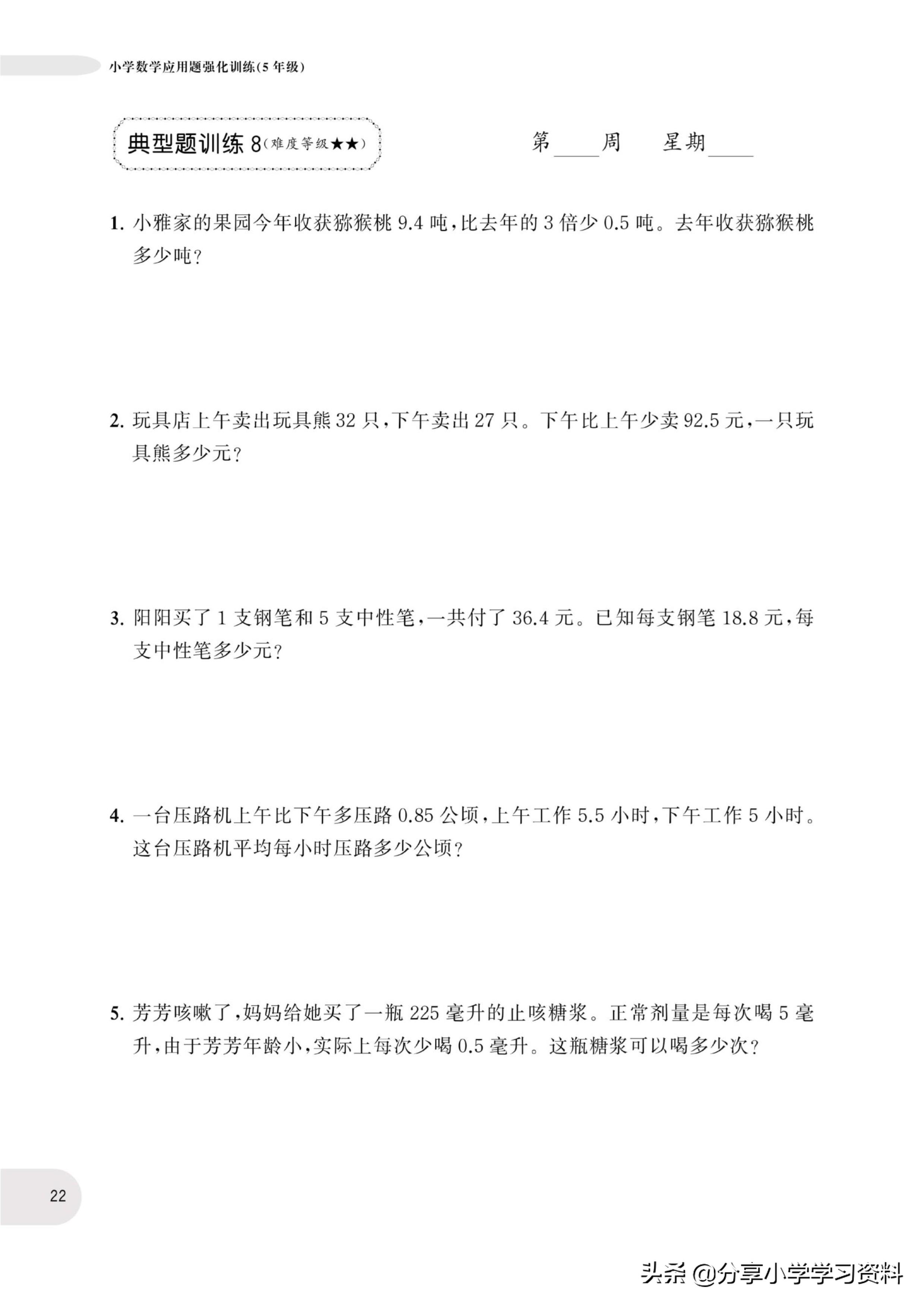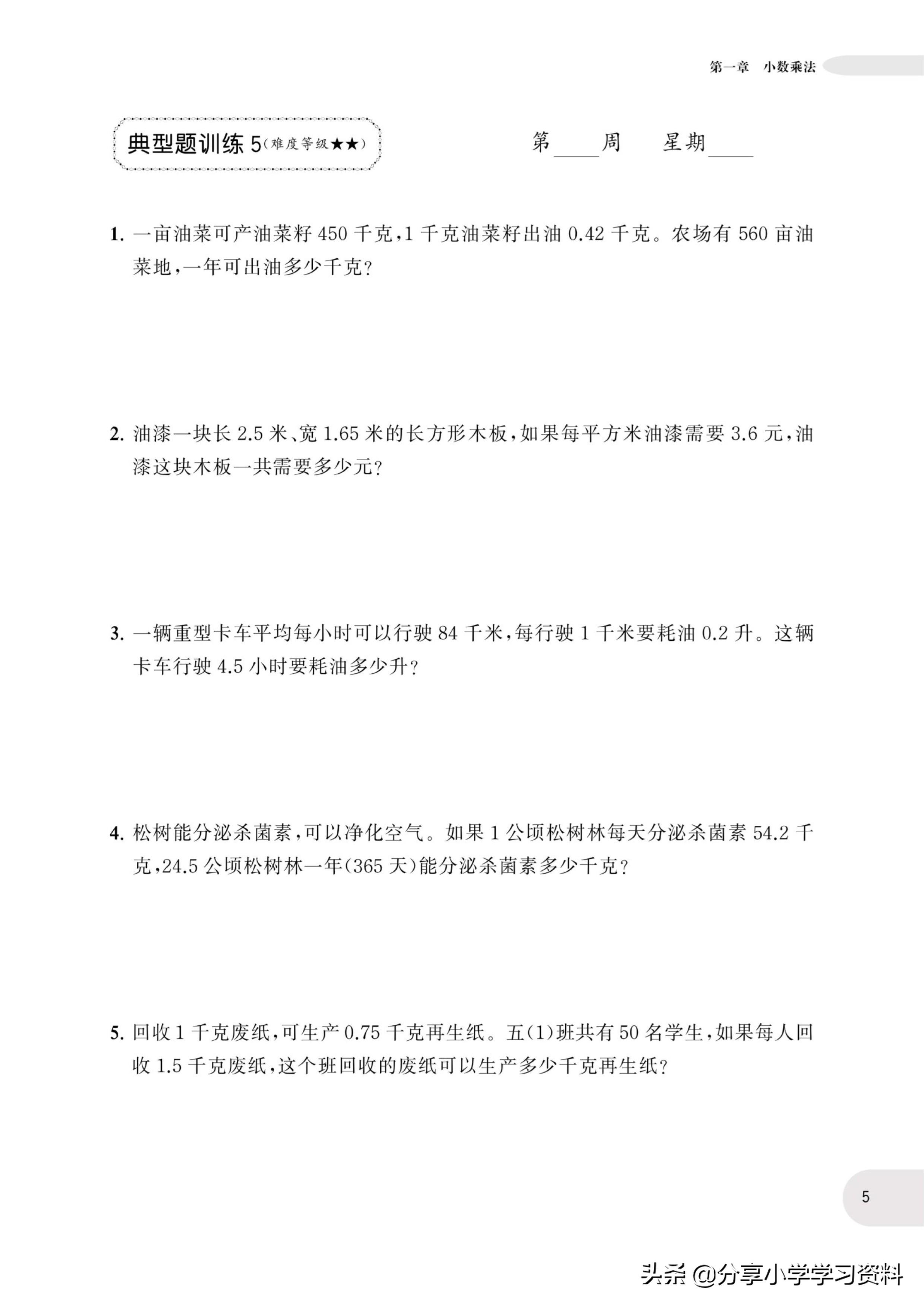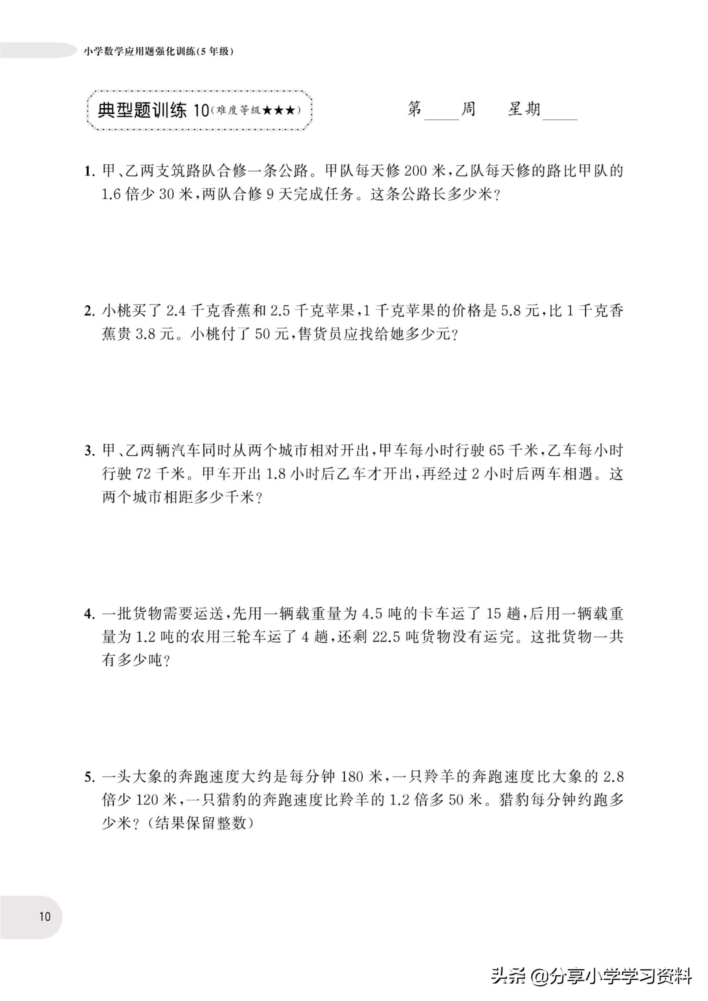 小学数学5年级上册应用题强化训练(有电子档)附答案