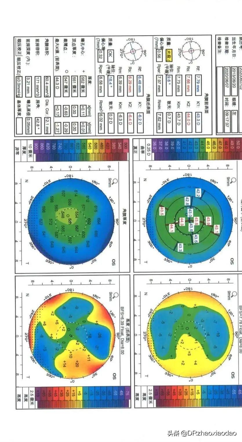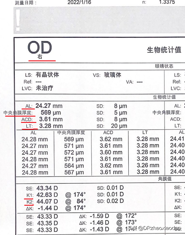 K1/K2:代表角膜两个垂直方向上的屈光力,K1是平坦轴的曲率,K2是陡峭轴的曲率,K2-K1就是角膜的散光。