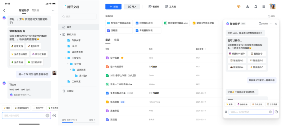 伴随AI技术迭代发展,腾讯文档智能助手只需“一句话”的指令,即可快速生成优质内容。用户通过腾讯文档电脑端或移动端开启智能助手,不仅可以生成任意品类的文档,也支持跨品类的信息处理,并高效完成多样工作需求。具体来说,在Word中可以进行主题创作、续写、润色等内容创作;在Excel中可以帮助处理复杂的数据内容,自动撰写函数、智能生成图表、输出分析报告等;还能根据大纲文档或思维导图一键生成PPT和演讲稿,并进行版式美化。