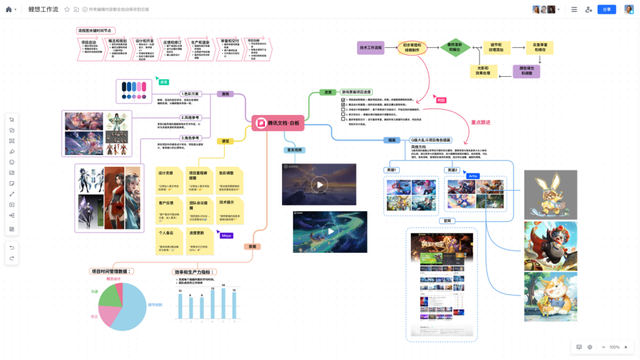 本次发布会上,腾讯文档自研产品矩阵迎来全新品类——智能白板。它是一个无限扩展空间的画布,为用户提供丰富的图形组件,支持自由的分区编辑功能,让用户得以用图形化的方式直观地表达各种想法和创意,在项目汇报、头脑风暴、在线教学等场景中被广泛应用。譬如游戏行业客户,他们会在这个无限画布中进行头脑风暴,把游戏的关卡策划、界面设计、研发进度管理等模块都在画布中进行呈现,打破项目信息差,提升协作效率。至此,腾讯文档已完成十大原生文档品类覆盖,在专业文档上全面兼容Office并符合PDF国际文档格式标准,在创新文档上满足用户多元的创作需求。