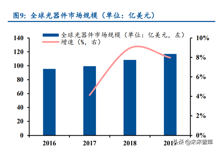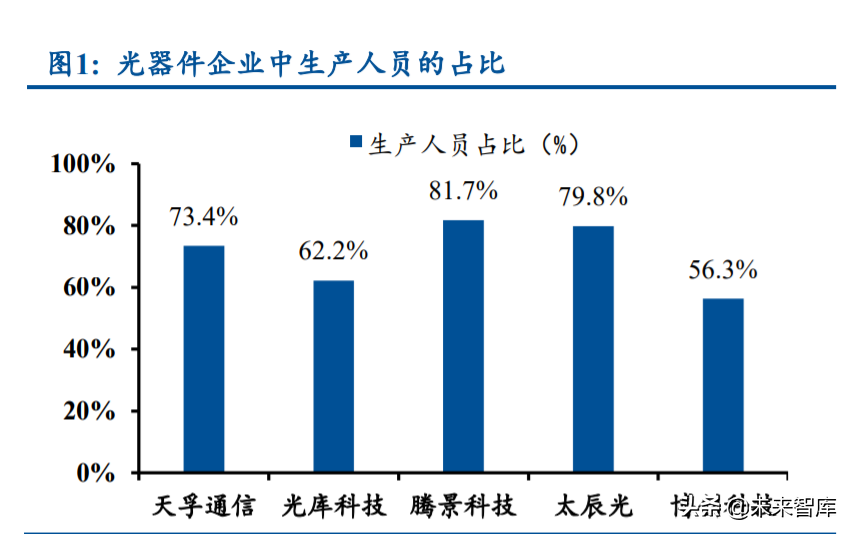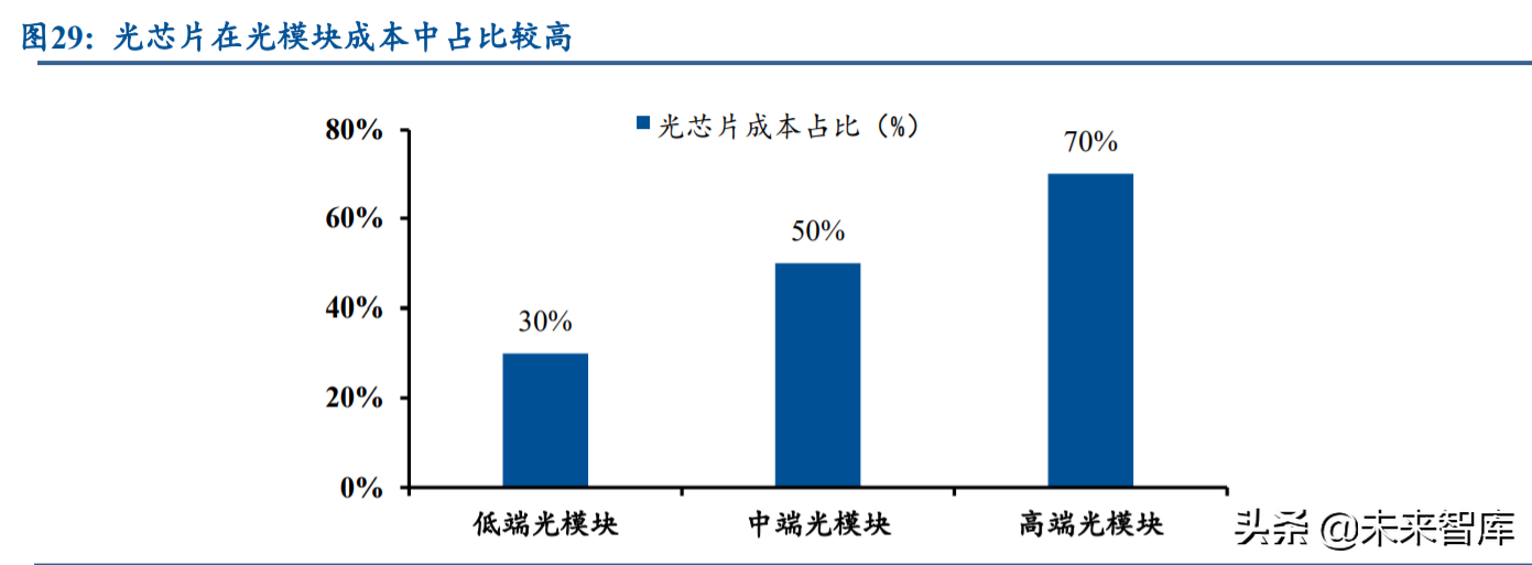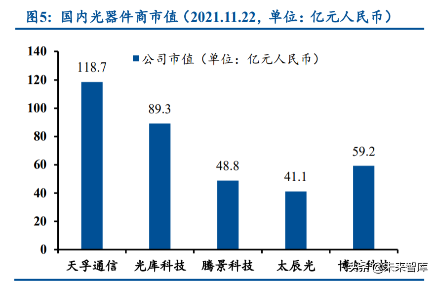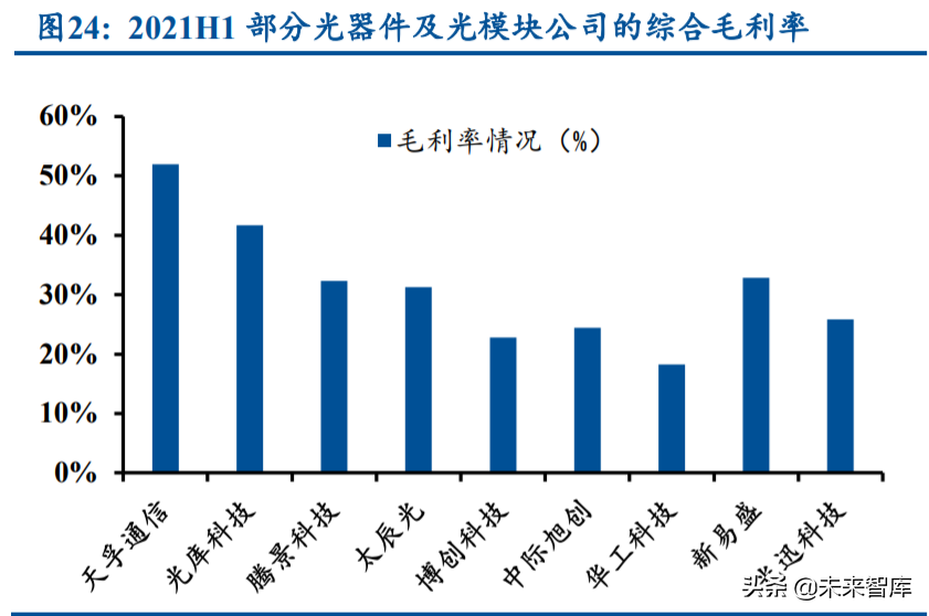 产业链上游光器件行业的整体竞争格局良好。虽然光器件产品品类繁多,部分低端产品的 入门门槛不高,但是头部厂商往往基于自身优势聚焦于不同的高端细分领域,这些领域的市场 规模不大、竞争对手不多、竞争并不激烈,因而整体格局良好,毛利率水平通常能够维持在高 位。以光库科技为例,公司在光纤激光器件领域重点聚焦高功率、高壁垒赛道,高功率隔离器 及高功率光纤光栅的全球市占率均超 50%,光纤激光器件业务的毛利率维持在 40%~50%的范围 内。(报告来源:未来智库)