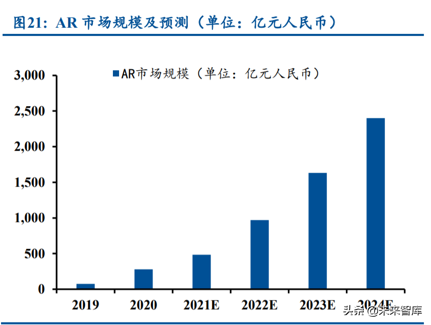 相对于传统的 2B 侧产品,消费电子产品需求量大,变化迭代快,市场空间更大。未来随 着元宇宙逐渐从概念走向现实,作为元宇宙底层硬件支持,AR 领域将迎来快速增长。 1)从 整体的市场规模来看,据中国信通院预测,全球 AR 市场规模在 2020-2024 的年复合增速为 54%,2024 年市场规模有望达 2400 亿元人民币;2)从产品出货量情况来看,2020 年 AR 眼镜全球出货量达 40 万台,同比增长 33.3%,预计到 2022 年 AR 的全 球出货量将达 140 万台。