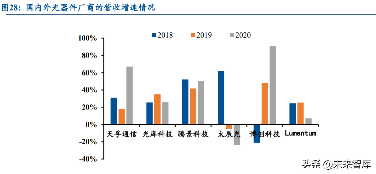 整体而言,在光通信产业链持续向国内转移的大背景下,国内光通信企业发展势头迅猛, 技术角度在部分高端领域持续取得突破,未来有望进一步替代国外厂商的份额,享受光通信 领域的国产化替代机遇。