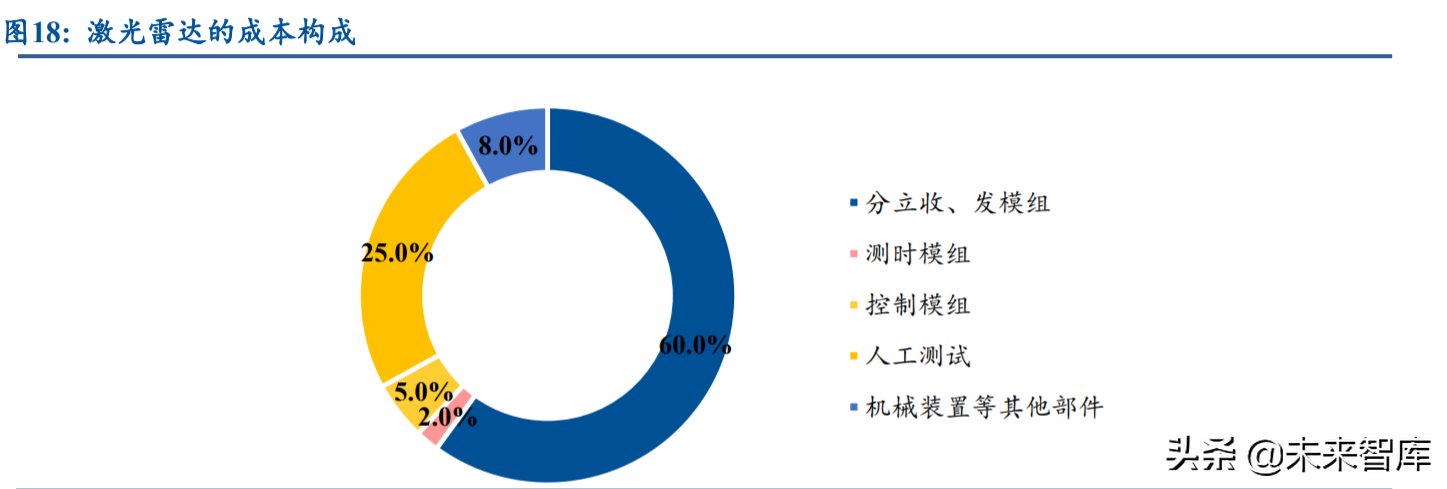 发展至今,自动驾驶领域环境感 知融合方案主要发展演化为两种,一种是以摄像头为主导,搭配毫米波雷达的融合方案,即“纯 视觉计算方案”,另一种是激光雷达主导,搭配摄像头和毫米波雷达的融合方案。前者虽然具 有较低的成本,但由于摄像头可能存在失真,因此需要进行大量数据积累并进行神经网络训练 弥补。后者具有更高的精确性,但当前成本相对更高。我们认为,未来随着激光雷达逐渐走向 成熟迎来成本下降,激光雷达主导的融合方案其渗透率将会有显著提升。