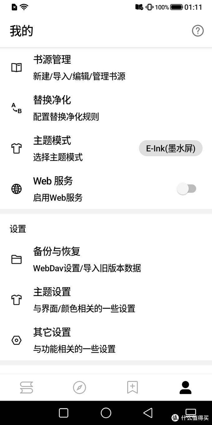 使用前记得在“我的”->“主题模式”中选择“E-ink墨水屏”,并在“我的”->“书源管理”中导入书源;书源可以在酷安评论区或者Github评论中找到。