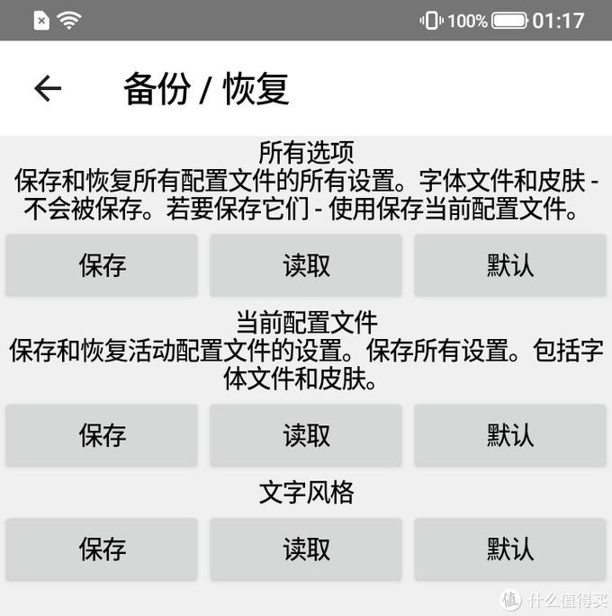 2、再在程序里,从左侧边缘右滑,打开菜单,选项,备份恢复,依次读取三个配置文件就可以了。记得三个文件要分别读取哦!每个配置都分为四个字体。