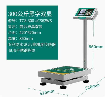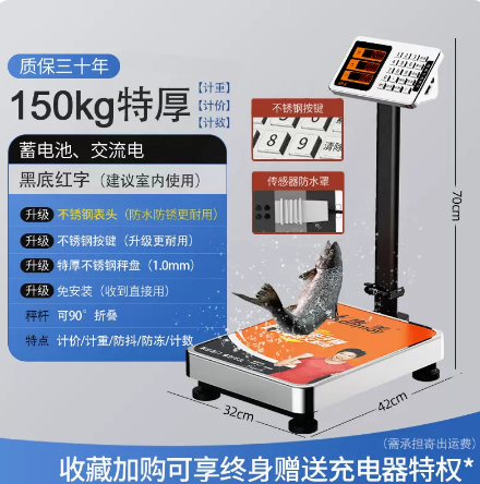 推荐理由:专注衡器20余年,完善的资质认证,高精度传感器,聚能蓄电瓶,前后双显,不锈钢秤盘,99次累计,智能计数