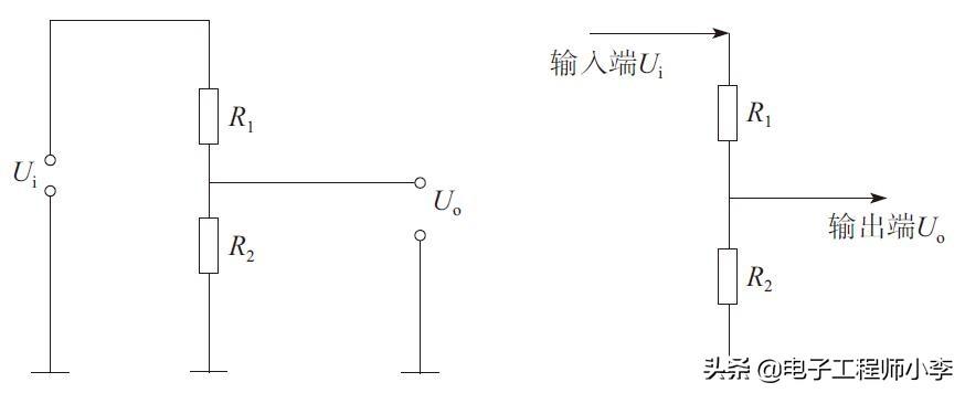 在分压电路中,电阻分压电路是最基本的分压电路。有时候电路中也会有电容、二极管、晶体管等电子元器件构成分压电路。分压电路有两个关键点:一个是输入端,另一个是输出端。