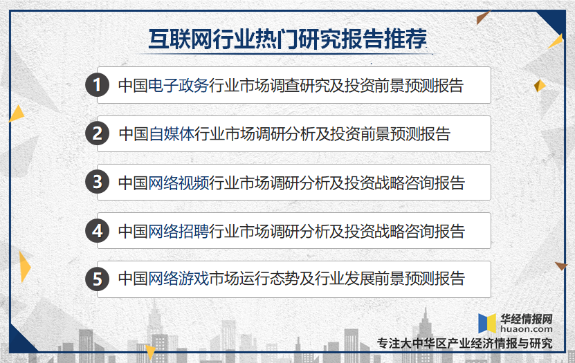 华经情报网隶属于华经产业研究院,专注大中华区产业经济情报及研究,目前主要提供的产品和服务包括传统及新兴行业研究、商业计划书、可行性研究、市场调研、专题报告、定制报告等。涵盖文化体育、物流旅游、健康养老、生物医药、能源化工、装备制造、汽车电子等领域,还深入研究智慧城市、智慧生活、智慧制造、新能源、新材料、新消费、新金融、人工智能、“互联网+”等新兴领域。