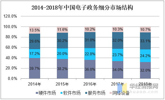 中国电子政务行业由硬件、软件、网络设备及服务四大细分市场构成。2018年硬件及服务的市场规模相对领先,占比分别为32.0%和33.1%,软件市场规模占比约为24.2%,网络设备市场规模较小,占比为10.7%。随着云计算以及互联网行业的发展,政府将传统的业务向网络转移,对于软件的需求会越来越高,未来软件市场将成为中国第一大市场。