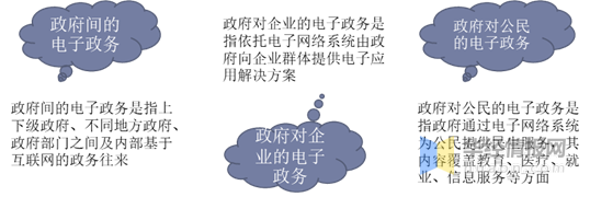 中国电子政务的应用领域主要包括政府间的电子政务、政府对企业间的电子政府以及政府对公民的电子政务。其中,政府间的电子政务是指上下级政府、不同地方政府、政府部门之间及内部基于互联网的政务往来;政府对企业的电子政务是指依托电子网络系统由政府向企业群体提供电子应用解决方案;政府对公民的电子政务是指政府通过电子网络系统为公民提供民生服务,其内容覆盖教育、医疗、就业、信息服务等方面。