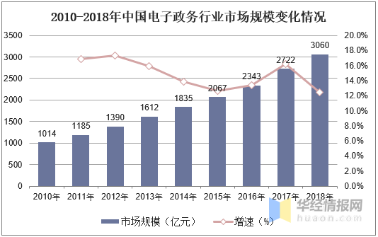 政府对政务信息化的重视程度不断加深,加上在组织领导、战略布局、政策发布等方面的部署,为行业发展提供了强有力的制度保障。伴随信息化基础设施建设、行业推广、市场监管等重要环节的宏观政策日趋完善,行业规模呈现稳定增长趋势。据统计,2014年至2018年期间,中国电子政务市场规模逐年扩张,2018年市场规模达到3060亿元,年复合增长率为14.8%。随着“十三五”规划的落实,未来中国电子政务的发展将进一步加快,其市场规模将逐步增加。