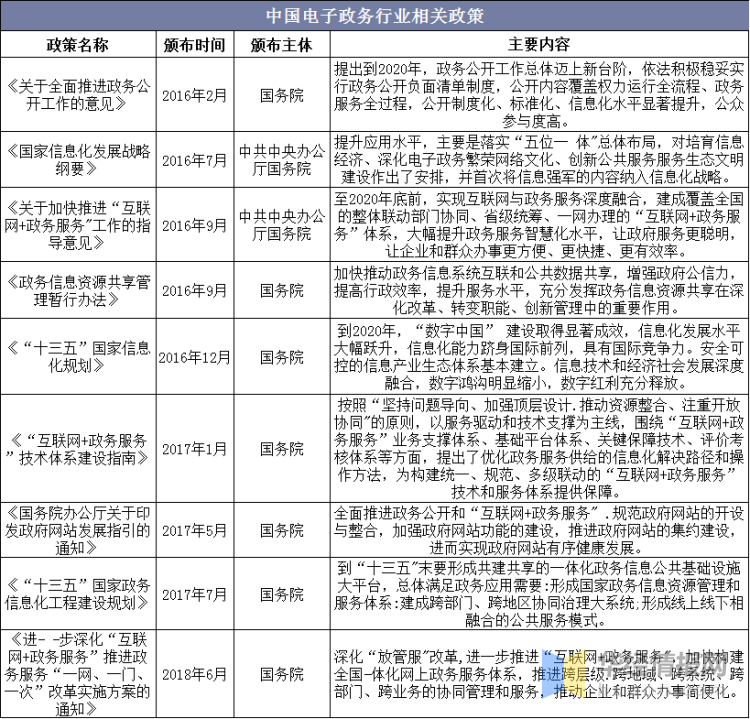 2016-2018年是我国电子政府发展的黄金时期,这一时期有关电子政务的政策密集出台,在战略布局、技术支持、数据共享开放等方面都出台了一些政策。例如在战略布局方面,《“十三五”国家信息化规划》明确了实现各部门信息共享以及建立公共数据资源开放共享体系的电子政务建设目标,并列出了应用基础设施建设、数据资源共享开放、“互联网+政务服务”等优先行动计划,为中国“十三五”电子政务发展指明了目标和方向。这些政策的颁布,为电子政务行业的发展营造了良好的环境,推动行业繁荣。
