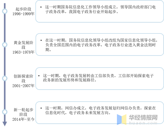 电子政务是指政府机构依托现代网络通讯与计算机技术,优化重组政府的工作流程及组织结构,使政府管理和服务职能在网络上实现。电子政务打破时间、空间的限制,为社会公众提供更全面、更优质规范的管理及服务。根据负责部门的不同,国内电子政务行业的发展共经历了四个阶段:1)起步阶段:国务院信息化工作领导小组时期(1996-1999);2)黄金发展阶段:国家信息化领导小组时期(2001-2007);3)创新探索阶段:工信部时期(2008-2014);4)新一轮起步阶段:网信办时期(2014-至今)。