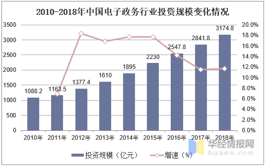 伴随中国政府向公共服务型政府转型,行业利好政策频繁出台,为中国电子政务产业带来较好的发展前景,吸引资本涌入。据统计,2018年中国电子政务产业的投资规模为3174.8亿,相较于2010年增长近三倍。未来伴随政务现代化进程的不断加快,中国电子政务行业投资规模将呈现稳步上升的发展趋势。